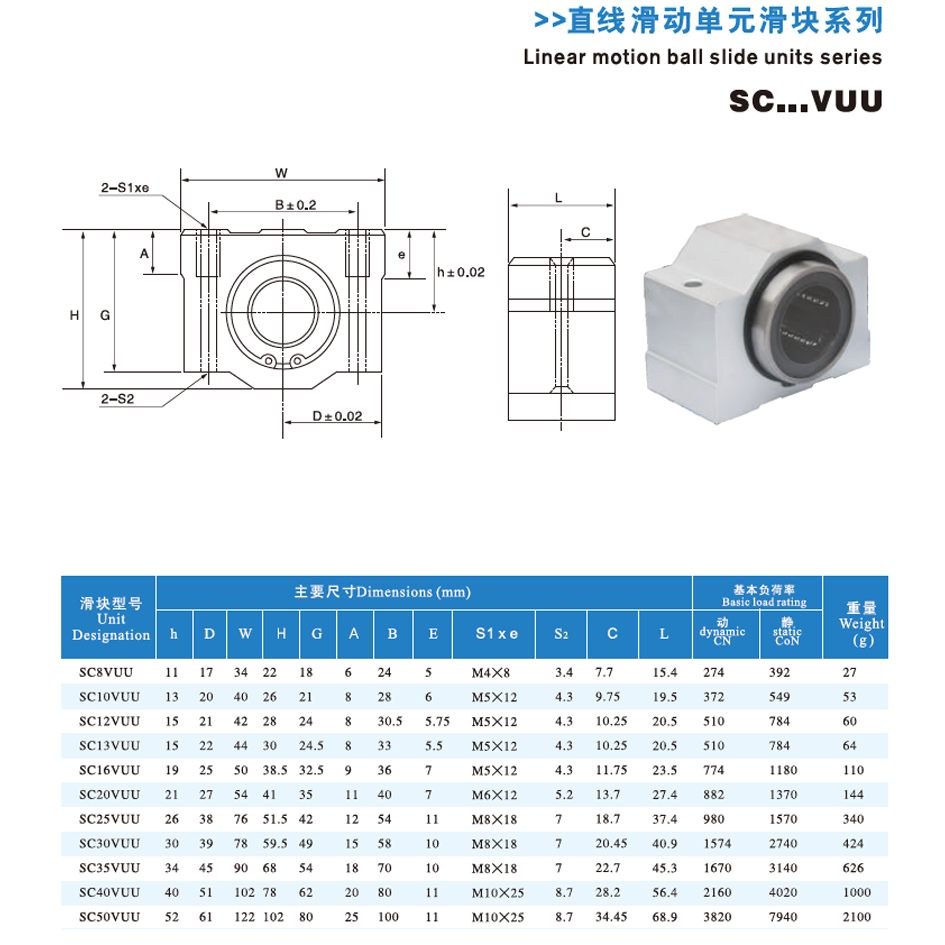 The Linear Motion Ball Slide Bearing SCV (Linear Block Ball Bearing) features anodized aluminum alloy housing and GCr15 bearing steel internal components with precision-machined ball grooves; it is mainly used in CNC machines, automated production lines, 3D printers, packaging machinery and other equipment requiring smooth and precise linear motion; maintenance involves storing in dry, dust-free environments, cleaning with non-abrasive agents, regularly lubricating with appropriate grease, and inspecting for ball bearing wear and installation tightness.
