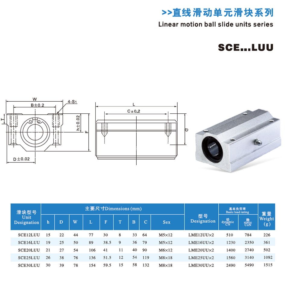 The Linear Motion Ball Slide Units Series SCE...LUU are composed of anodized aluminum alloy housings and GCr15 bearing steel internal bearings; they are mainly used in automated transmission systems, air cylinders, oil cylinders, packaging machinery, textile machinery, injection molding machines and other equipment requiring linear motion; maintenance involves storing in dry, dust-free environments, cleaning with non-abrasive agents, regularly lubricating with appropriate grease, and inspecting for bearing wear and installation tightness.