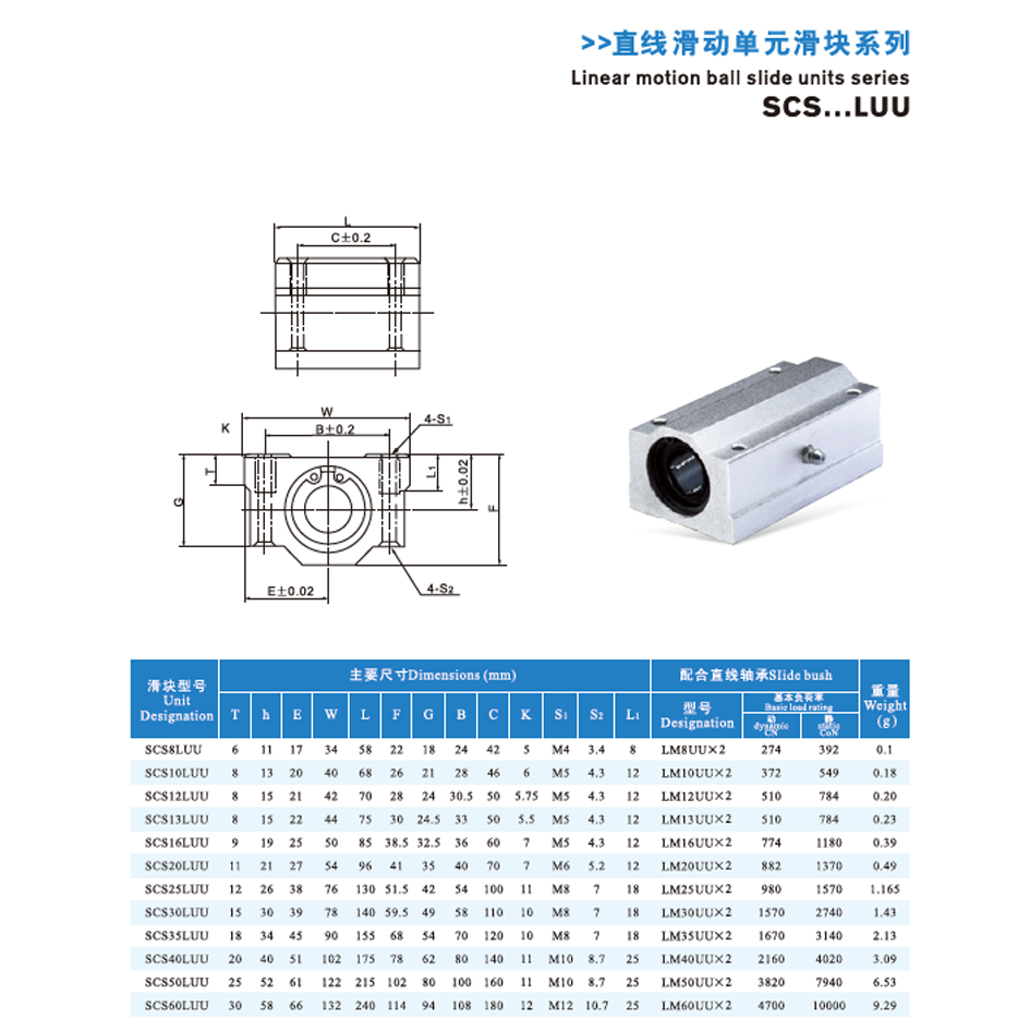 The Linear Motion Ball Slide Units Series SCS...LUU consist of an aluminum alloy block body and built-in GCr15 bearing steel linear bearings; they are mainly used in CNC machines, 3D printers, automated equipment, medical devices, printing and packaging machinery requiring smooth linear motion; maintenance involves storing in dry, dust-free environments, cleaning with non-abrasive agents, regularly lubricating with appropriate grease, and inspecting for bearing wear and installation tightness.