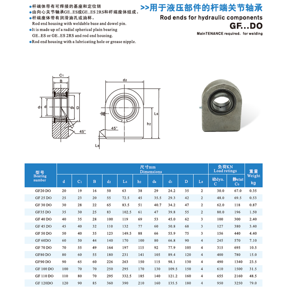 The Rod ends for hydraulic components GF...DO are made of S355J2G3 structural steel (or AISI316 stainless steel for corrosion resistance) housing and phosphated GCr15 bearing steel internal components, with optional PTFE liners; they are mainly used in hydraulic cylinders, hydraulic systems and heavy-duty equipment requiring radial/axial load bearing and angular misalignment compensation; maintenance involves storing in dry, dust-free environments, cleaning with non-abrasive agents, regularly replenishing appropriate grease, and inspecting for wear and assembly tightness.