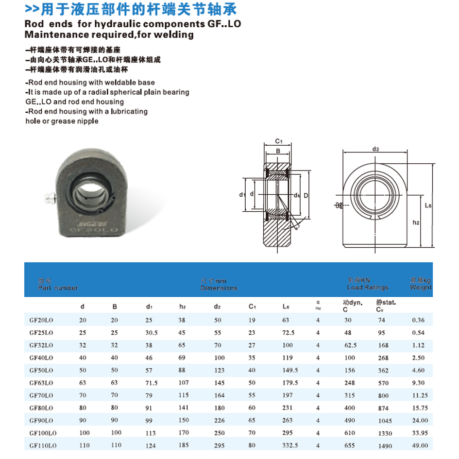 The Rod ends for hydraulic components GF...LO are made of S355J2G3 carbon steel housing (zinc-plated surface) and phosphated GCr15 bearing steel internal components; they are mainly used in engineering hydraulic cylinders, forging machines, agricultural machinery and material handling equipment requiring radial load bearing and angular misalignment compensation; maintenance involves storing in dry, dust-free environments, cleaning with non-abrasive agents, regularly replenishing appropriate grease, and inspecting for wear and assembly tightness.