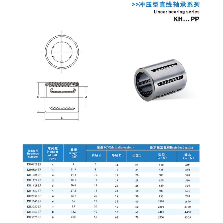 The KH...PP Series Linear Bearing is made of stamped and hardened steel/alloy steel outer ring, polyamide (or glass fiber-reinforced phenolic resin) cage, polyester elastomer/rubber double-sided lip seals (PP suffix), and pre-filled lithium-based or special lubricating grease; it is mainly used in CNC machines, automation equipment, packaging machinery, medical devices, semiconductor equipment and transport systems requiring compact installation, high-speed precision linear motion and low space demand; maintenance involves storing in dry, dust-free environments, cleaning with non-abrasive agents, regularly replenishing matching lubricant, inspecting for shaft wear and seal integrity, and avoiding contact with strong chemicals or prolonged sunlight exposure.