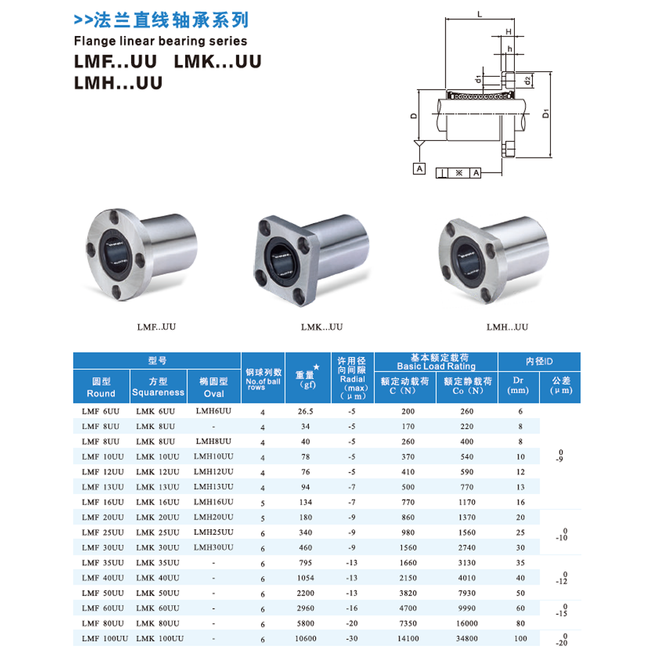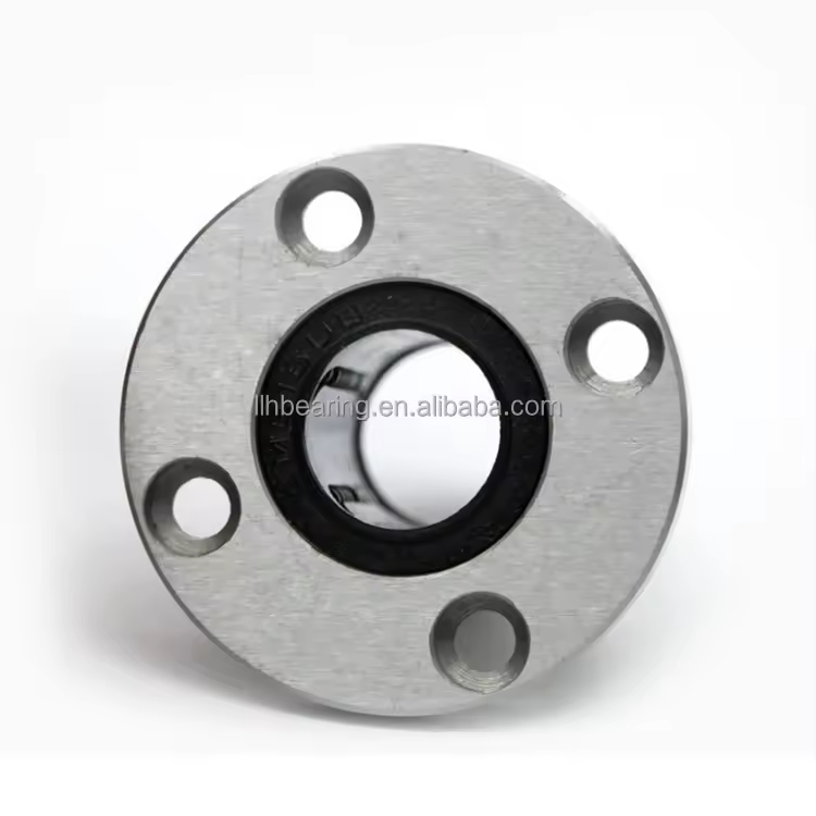 The LMF...UU Series Flange Linear Bearing is made of SAE-52100 (GCr15) bearing steel outer sleeve, nylon (resin) retainer, double-sided rubber seals (UU), and pre-filled lithium-based grease; it is mainly used in CNC machines, automation equipment, precision instruments, packaging machinery, 3D printers and electronic devices requiring smooth and precise linear motion; maintenance involves storing in dry, dust-free environments, cleaning with non-abrasive agents, regularly replenishing lubricant, and inspecting for shaft wear and seal integrity.