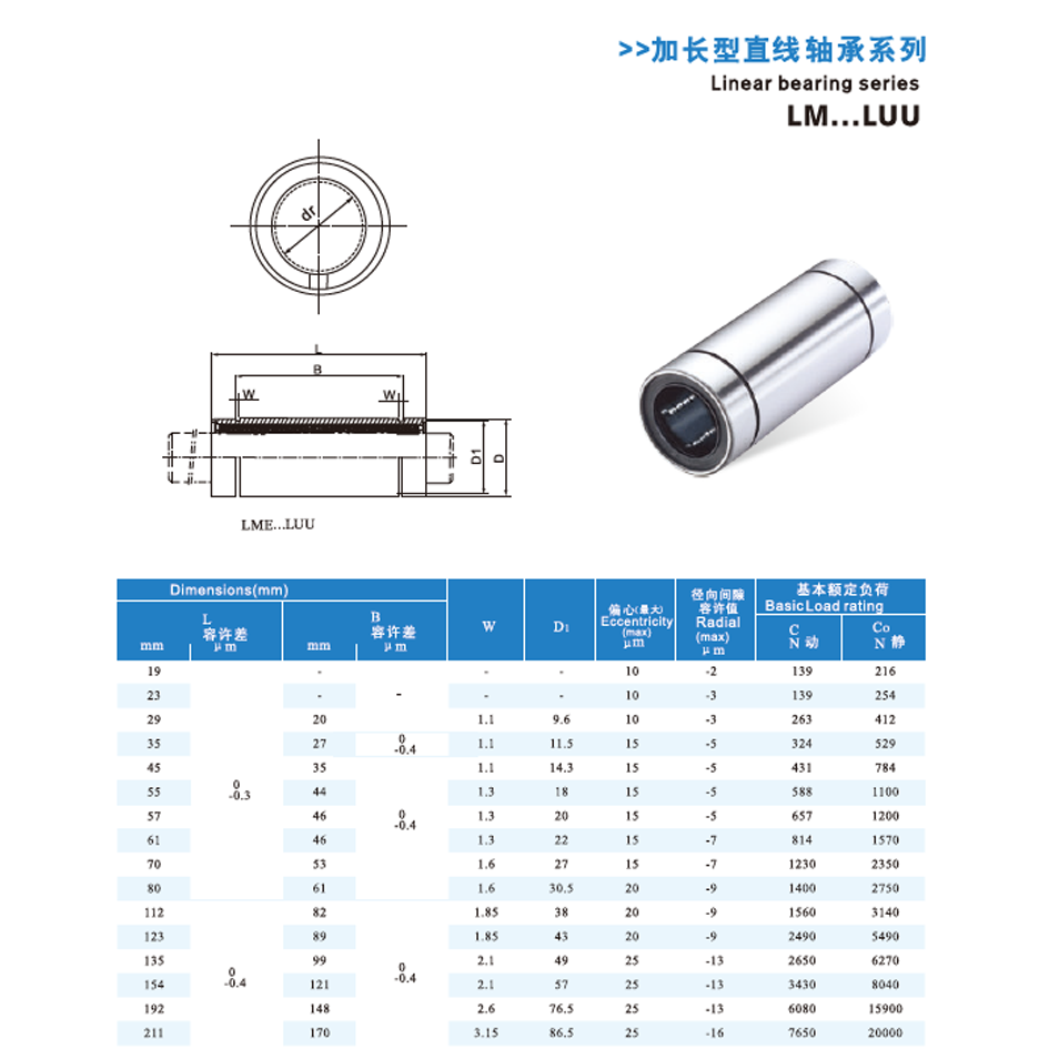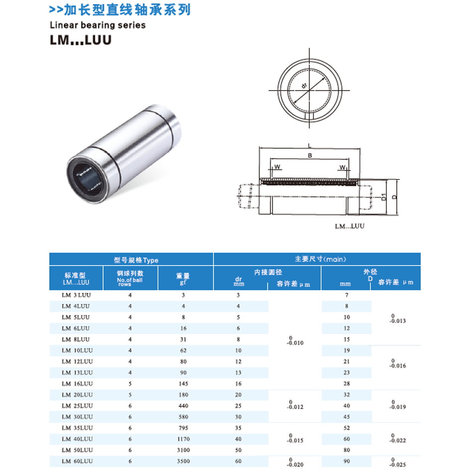 The Extended Linear Bearing Series LM...LUU is made of GCr15 (SAE-52100) bearing steel outer sleeve, synthetic resin retainer, double-sided rubber seals (LUU), and pre-filled lubricant; it is mainly used in CNC machines, robotics, medical equipment, precision instruments and automation machinery requiring stable linear motion with heavy load capacity; maintenance involves storing in dry, dust-free environments, cleaning with non-abrasive agents, regularly replenishing lubricant, and inspecting for shaft wear and seal integrity.