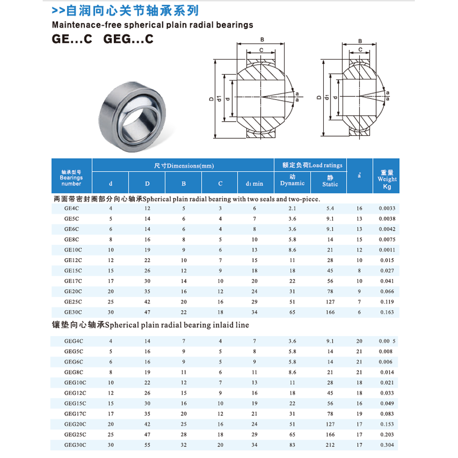 The GE C Series Radial Spherical Plain Bearings (including GE10C) are made of carbon steel outer rings, carbon-chromium steel inner rings (hard chrome-plated sliding surfaces) and PTFE composite liners; they are mainly used in industrial automation equipment, general machinery and light industrial machinery requiring radial load bearing, angular misalignment compensation and maintenance-free operation; maintenance involves storing in dry, dust-free environments, cleaning with non-abrasive agents, and inspecting for sliding surface wear without the need for additional lubrication.