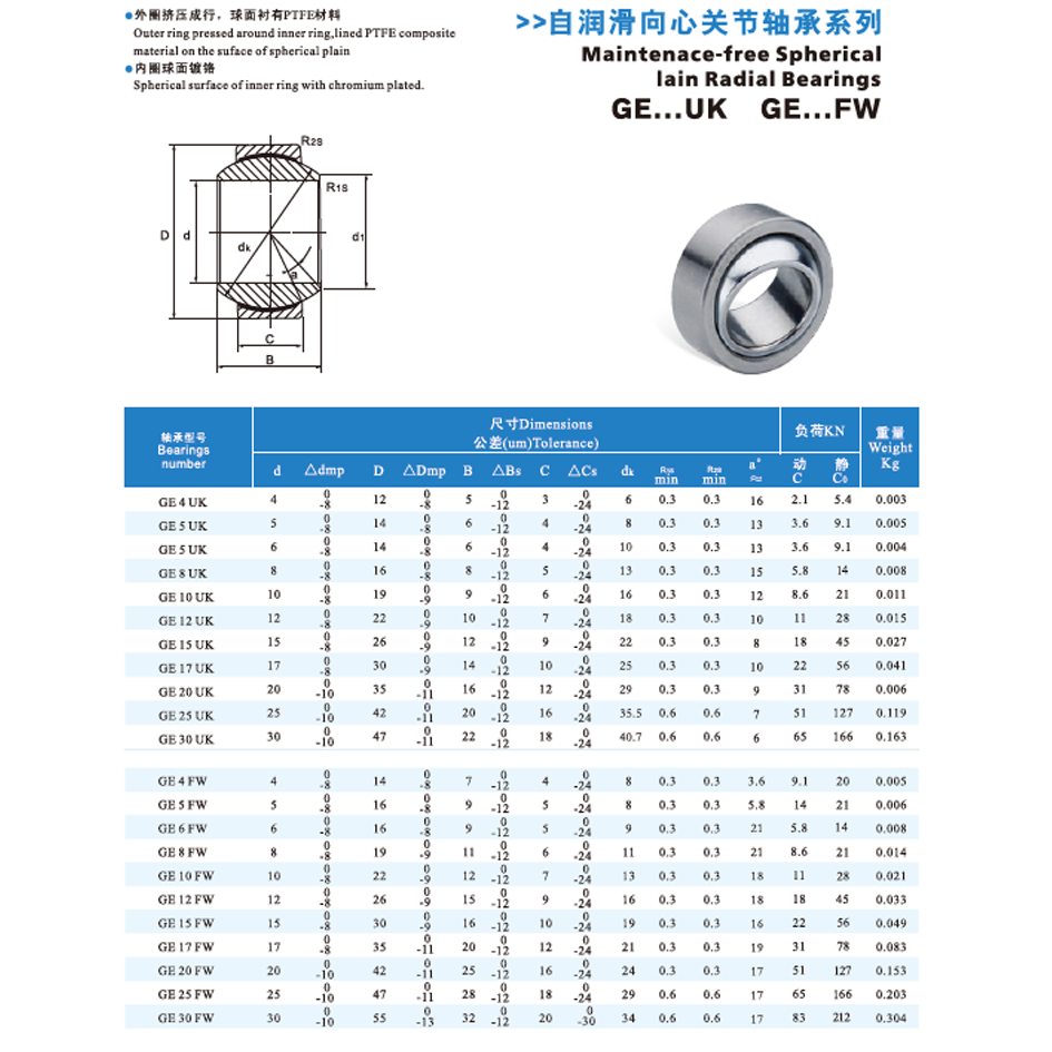 The Spherical Plain Bearing GE 40 UK 2RS is made of bearing steel (inner ring with hard chrome plating, outer ring with phosphating treatment) and PTFE lining, with double-sided rubber seals; it is mainly used in construction machinery, automotive equipment, industrial automation and hydraulic cylinders requiring radial load bearing and angular misalignment compensation; maintenance involves storing in dry, dust-free environments, cleaning with non-abrasive agents, protecting the seals from damage, and inspecting for wear without the need for additional lubrication.