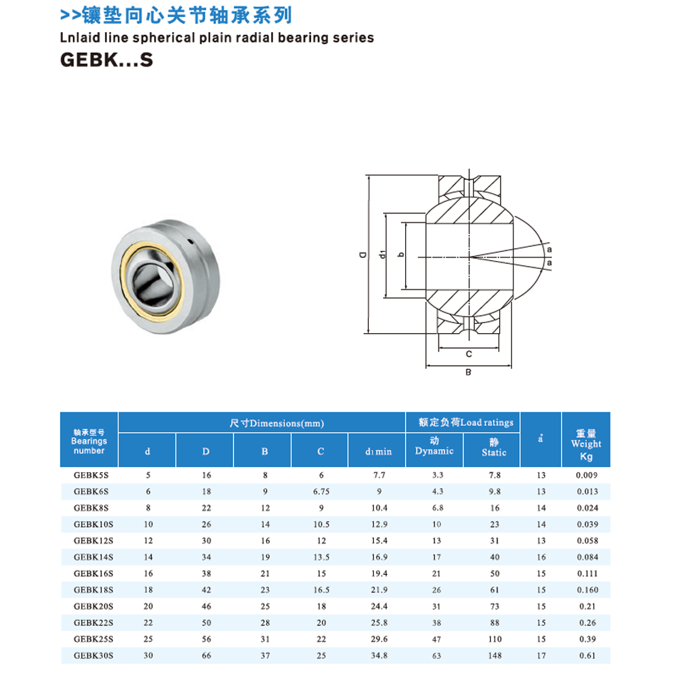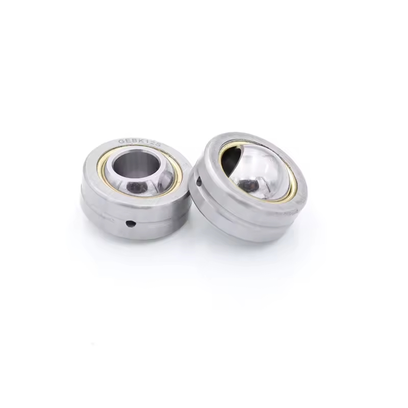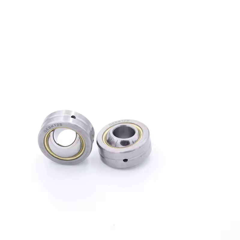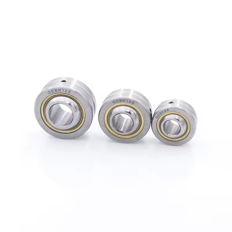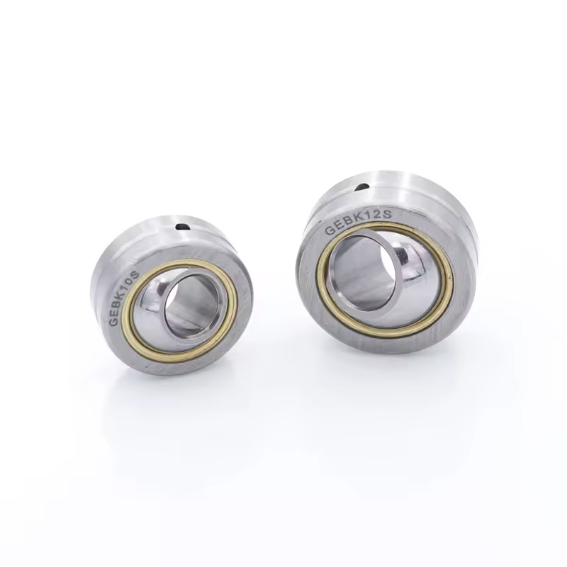 The GEBK Series Radial Joint Bearings (including GEBK5S/6S/8S/10S/12S/EBK14S) are composed of carbon steel outer rings with bronze liners and hardened GCr15 bearing steel inner rings (spherical surface hard chrome-plated); they are mainly used in construction machinery, hydraulic cylinders, forging machines, automation equipment, automobile shock absorbers and water conservancy machinery requiring radial load bearing and angular compensation; maintenance involves storing in dry environments, cleaning with non-abrasive agents, regularly adding appropriate grease, and inspecting for raceway wear and assembly tightness.