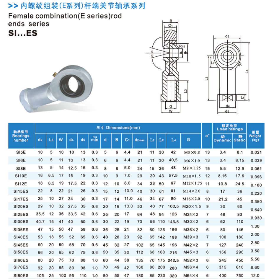 Rod End Bearing SI8ES SI10ES SI12ES SI15ES SI17ES SI20ES SI25ES SI30ES SI35ES SI40ES SI50ES SI60ES SI80ES Ball Joint Bearings
