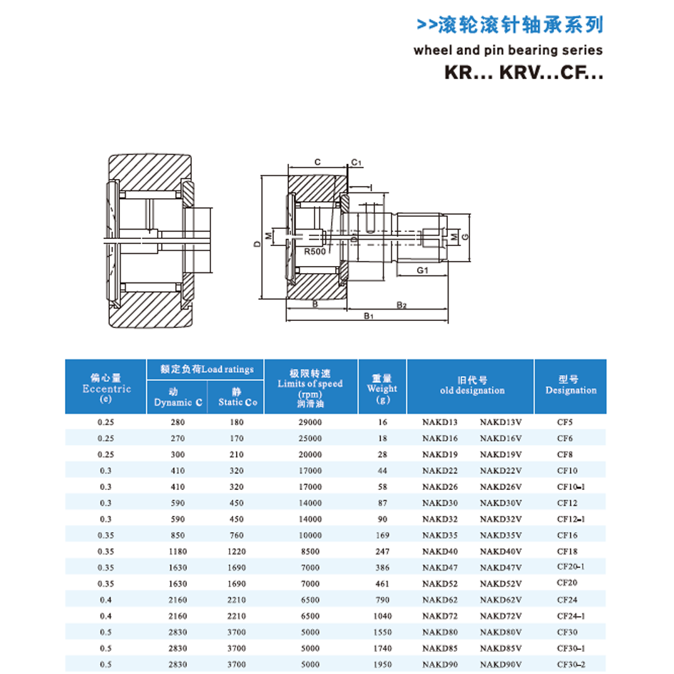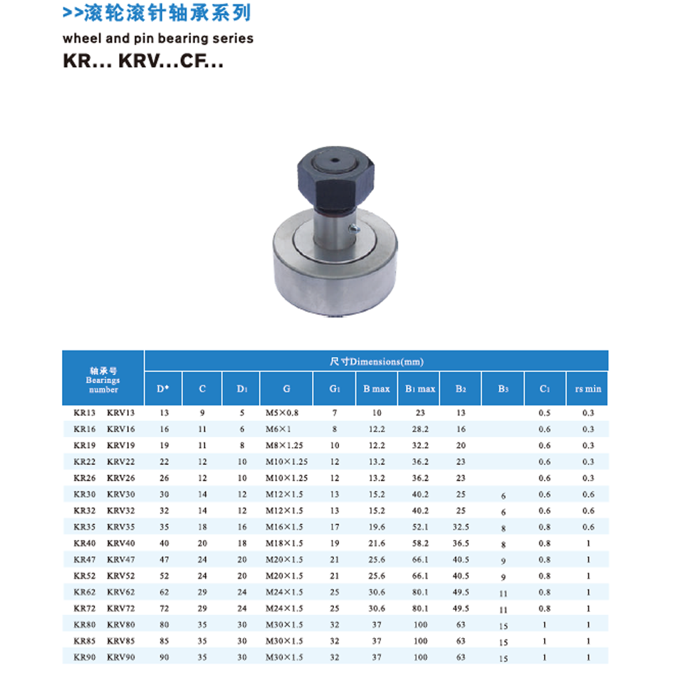 The Track Roller Bearing CF (Cam Follower, Stud Type) is made of high-carbon chromium bearing steel (GCr15) with hardened raceways and rollers, and the stud is of high-strength alloy steel; it is mainly used in conveyors, printing machinery, automated production lines, machine tools and cam mechanisms requiring rolling motion along tracks or cam profiles; maintenance involves storing in dry environments, cleaning with non-abrasive agents, regularly lubricating via grease fittings (where applicable), and inspecting for roller wear, stud tightness and seal integrity.