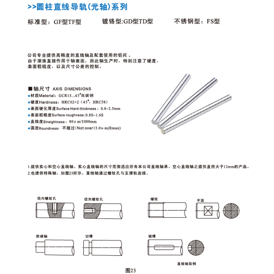 The SFC guide rail for linear bearings is made of high-carbon chromium bearing steel (SUJ2/GCr15) with chrome-plated or nitrided surface treatment to enhance wear resistance and corrosion protection, mainly used for linear motion guidance in automation equipment, machine tools, conveyor systems, precision machinery and industrial production lines; maintenance involves regularly cleaning the surface with a dry cloth to remove dust and debris, applying appropriate lubricating grease every 3-6 months for smooth operation, inspecting and tightening loose fasteners promptly, avoiding exposure to corrosive environments or heavy impacts, and replacing it when abnormal noise, jamming or excessive wear occurs.